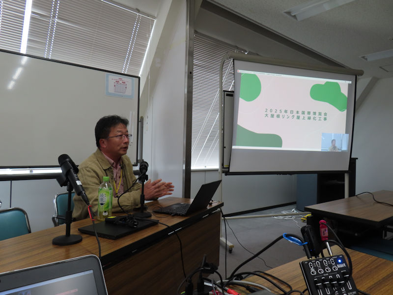 | -14:00- では、第47回 草屋根の研究会開始です。 まず、代表の前田由利さんからご挨拶。 実は、草屋根の会で大屋根リングを草屋根にしようという提案を万博事務局に出していたのですがそれは採用されず。 しかし、結局のとkろ、大屋根リングは緑化されたといういきさつがありますので、少なからず草屋根の会の影響力はあった・・・と信じたいですね。 そして、昨年開催された大阪・関西万博で植栽を担当された法人会員の田中松壽園・田中武志社長からのお話しです。 大林環境技術研究所・大林 武彦社長は直前に都合悪くなり、今回はお話しが伺えず。 |