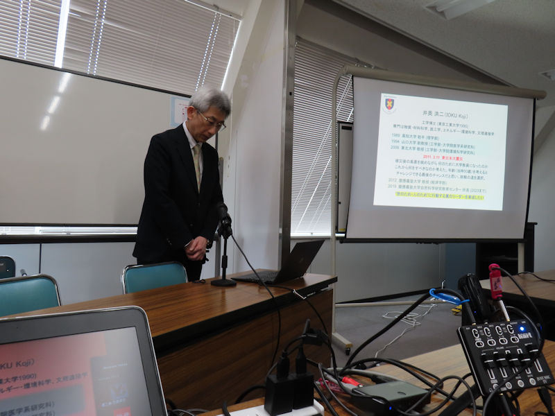 | 田中社長からは工事段階から開催期間中のお仕事についてご報告いただくという内容。 大屋根リングは、外周約2km、高さ約20m(外側)の「世界最大級の木造建築物」です。 植栽はしましたが、屋根として建設されたものではないので、防水はされていません。 植物は重量軽減のため土の代わりにリサイクル素材の軽量マットにポット植えされ、その植物廻りの土だけで生きていたとのこと。 したがって潅水などすれば余剰な水は下に落ちることもあり、それをマスコミが「雨漏り」などと報道したようですが、防水していないなら当たり前のことですよね。 その他、いろいろと苦労話や裏話をたくさん聞かせていただけました。 続いて、慶応義塾大学経済学部 井奥洪二教授の基調講演です。 |