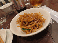 | 途中で紹興酒にシフト。 ロックでチェイサーいただいて飲みます。 最初は2合でお願いしましたが、おかわり頼むとボトルがきました(笑) |